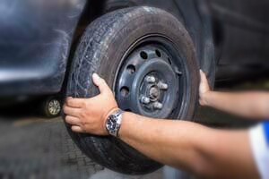 - Pegang sisi roda bagian atas dan bagian bawah, kemudian goyangkan roda ke arah dalam dan luar.