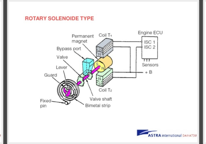 ISC valve jenis ini secara prinsip hampir sama dengan ISC valve jenis stepper motor, hanya saja komponen yang digunakan untuk mengatur besar kecilnya saluran by-pass berbeda. Pada ISC valve jenis ini komponen penggeraknya menggunakan rotary dan selenoid. Selenoid berfungsi untuk membangkitkan kemagnetan sehingga rotary dapat bergerak atau berputar, rotary ketika bergerak ini berfungsi untuk mengatur bukaan saluran by-pass yang dibantu dengan plat bimetal yang difungsikan untuk penyeimbang dan sebagai pegas pengembali.