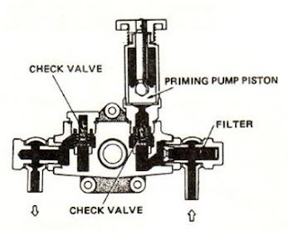 Tekan handle pompa diafragma ke bawah dan bahan bakar atau udara dalam ruang pompa akan akan membuka outlet check valve dan mengalir ke saringan bahan bakar. Pada saat yang sama inlet check valve akan menutup dan mencegah bahan bakar mengalir kembali. Lihat gambar berikut ini.